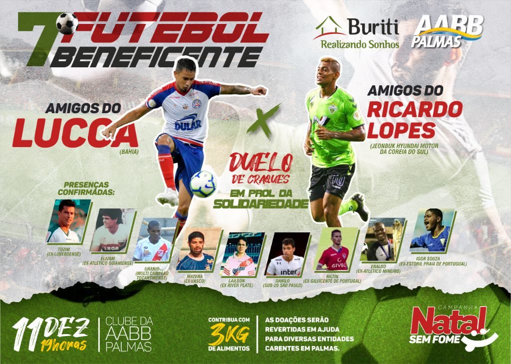 Sétima edição do Futebol Beneficente da AABB/Buriti acontece hoje em Palmas. Tudo pronto para a grande festa da sétima edição do Futebol Beneficente, que acontece hoje (11) de dezembro, a partir das 19 horas, na sede da Associação Atlética Banco do Brasil (AABB) de Palmas.