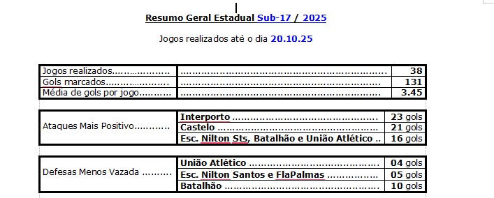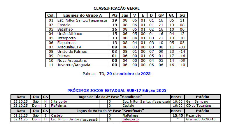 Os quatro semifinalistas do Campeonato Tocantinense Sub-17 estão definidos após os jogos de volta da segunda fase, realizados no último fim de semana. As equipes classificadas são Interporto, Escolinha Nilton Santos/Taquarussú, FlaPalmas e Castelo (Gurupi), que seguem firmes na disputa pelo título da competição.