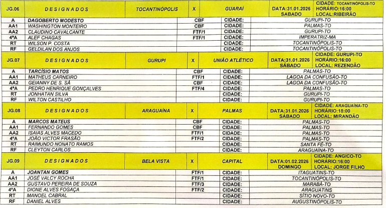 A Comissão Estadual de Arbitragem do Futebol (CEAF) divulgou a escala de arbitragem para os confrontos da Terceira rodada do Campeonato Tocantinense 2026,Troféu José Bonifácio, que acontecem neste fim de semana em quatro cidades do estado.