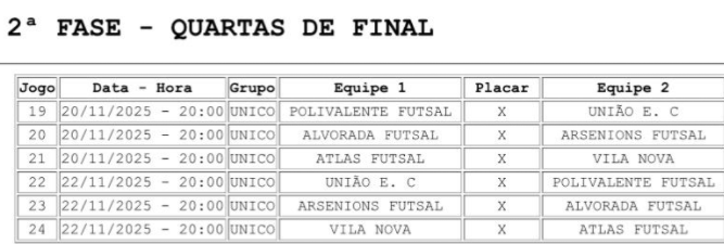 Com esses resultados, os confrontos das quartas de final da Série Ouro de Futsal Tocantins já estão confirmados para o dia 20 de novembro: