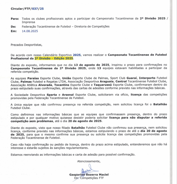 A FTF estabelece novo prazo até 20 de agosto de 2025 para que o Batalhão Futebol Clube se manifeste, confirmando presença ou solicitando licença. A ausência de resposta será interpretada como desinteresse e poderá implicar sanções conforme o regulamento vigente. Para facilitar a confirmação, a FTF está reenviando as informações básicas e a carta de adesão.