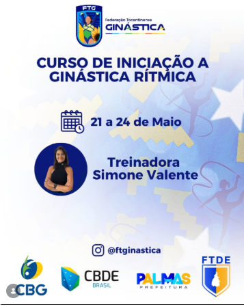 A Federação Tocantinense de Ginástica (FTG) abre inscrições para o Curso de Iniciação à Ginástica Rítmica, que será realizado entre os dias 21 e 24 de maio, em Palmas. A capacitação será conduzida pela treinadora Simone Valente, profissional com ampla experiência na modalidade.