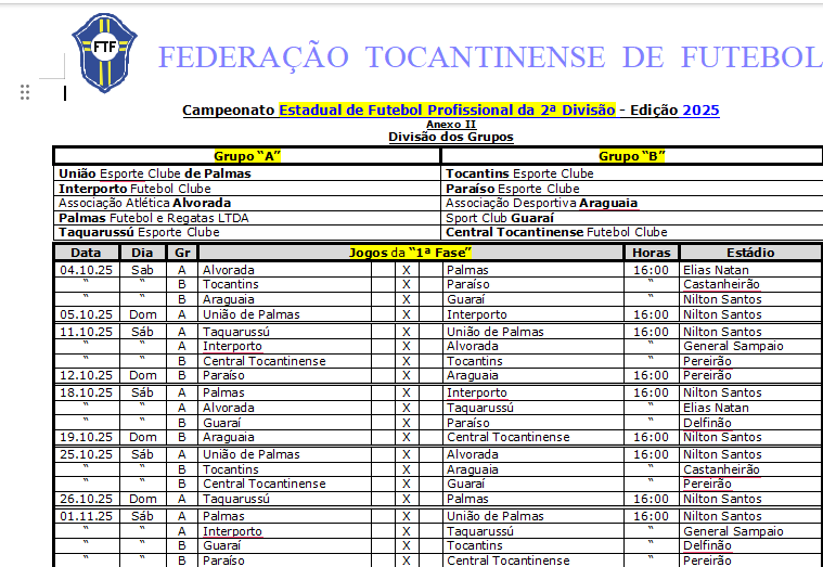 A Federação Tocantinense de Futebol (FTF) divulgou a tabela e o regulamento do Campeonato Tocantinense da Segunda Divisão 2025, que este ano prestará homenagem ao narrador esportivo Domingos Santos, falecido no início de maio. A competição, intitulada “Taça Domingos Santos”, reconhece os relevantes serviços prestados por ele ao futebol tocantinense.