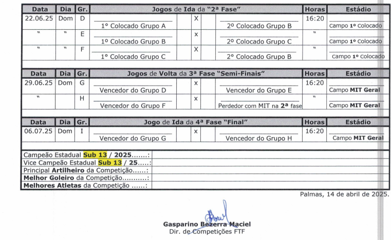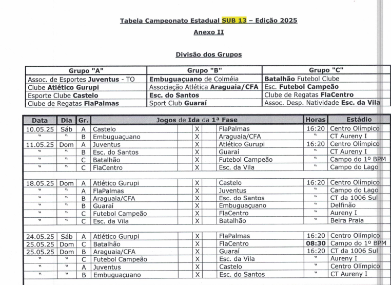 A Federação Tocantinense de Futebol (FTF) divulgou a tabela oficial do Campeonato Estadual Sub-13, que terá início no dia 10 de maio e a grande final prevista para o dia 6 de julho. Ao todo, 12 equipes participarão da competição, divididas em três grupos com quatro times cada, denominados A, B e C.