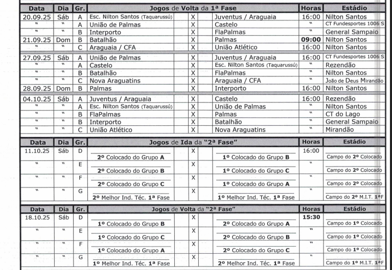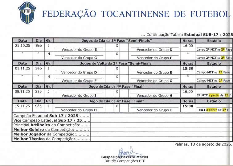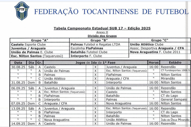 A Federação Tocantinense de Futebol (FTF) divulgou, na tarde desta terça-feira (19), a tabela e o regulamento do Campeonato Tocantinense Sub-17, que terá início no dia 30 de agosto e decisão marcada para 15 de novembro.