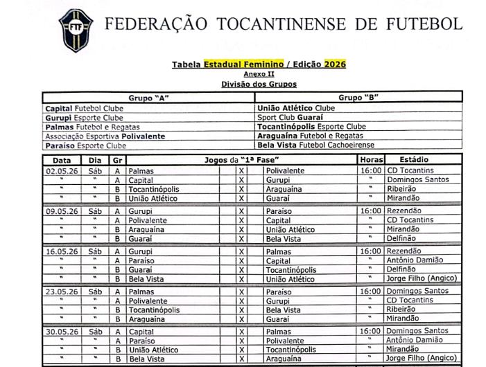 A Federação Tocantinense de Futebol (FTF) divulgou a revisão definitiva da tabela do Campeonato Tocantinense Feminino 2026. A competição contará com 10 equipes, divididas em dois grupos de cinco times, e tem início marcado para o dia 2 de maio.