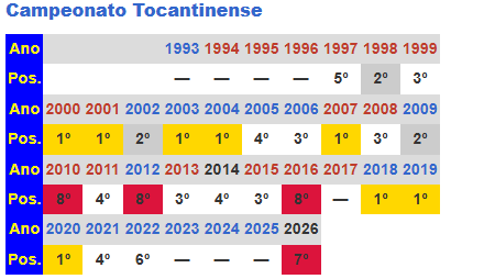 A queda de 2026 marca o terceiro rebaixamento dentro de campo do Palmas Futebol e Regatas na história do Campeonato Tocantinense. O clube da capital já havia sido rebaixado anteriormente nas temporadas de 2010 e 2017.
