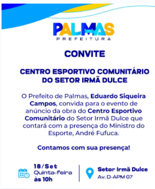 A Prefeitura de Palmas realiza, nesta quinta-feira, 18 de setembro, às 10h, o evento de lançamento da construção do Centro Esportivo Comunitário do Setor Irmã Dulce. A cerimônia contará com a presença do prefeito Eduardo Siqueira Campos e do ministro do Esporte, André Fufuca.