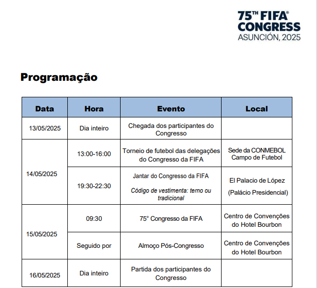 De acordo com Leomar Quintanilha, o encontro reunirá representantes das 211 associações filiadas à FIFA. Entre os temas da pauta estão a votação da prestação de contas de 2024, a aprovação do orçamento para os próximos anos e debates sobre o desenvolvimento do futebol mundial, com destaque para medidas de combate ao racismo.