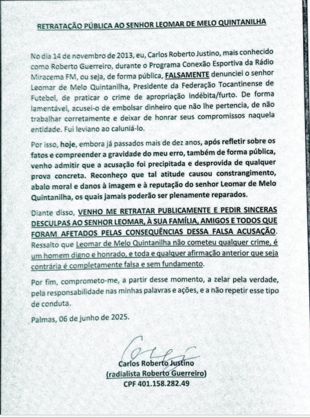 “No dia 14 de novembro de 2013, eu, Carlos Roberto Justino, conhecido como Roberto Guerreiro, durante o programa Conexão Esportiva da Rádio Miracema FM, fiz acusações públicas e infundadas contra o senhor Leomar de Melo Quintanilha, presidente da FTF, imputando-lhe falsamente a prática de crimes como apropriação indébita e furto.