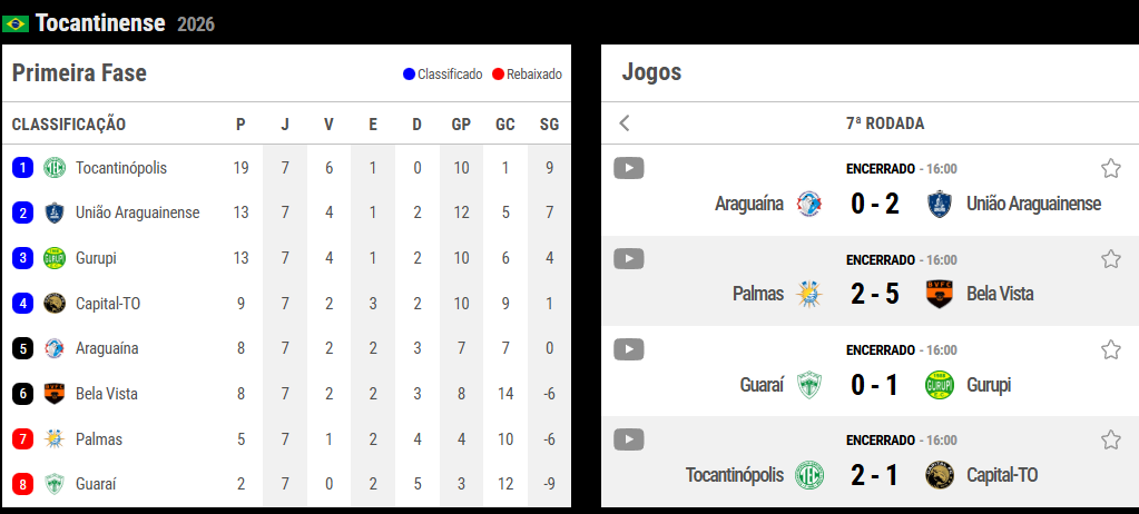 As semifinais do Campeonato Tocantinense 2026 estão definidas. Tocantinópolis Esporte Clube x Capital Futebol Clube e União Araguainense x Gurupi Esporte Clube são os confrontos da próxima fase, após a realização da sétima e última rodada da primeira fase, disputada neste sábado (7), pelo estadual – Troféu José Bonifácio. Os jogos de ida acontecerão dia 14), e a volta, dia 21 de março.