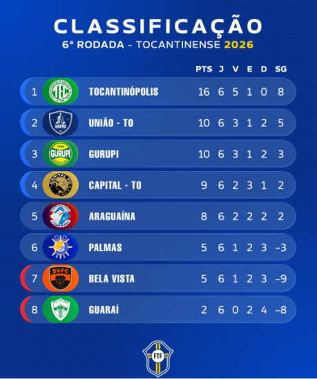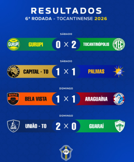 A sexta rodada do Campeonato Tocantinense – Troféu José Bonifácio foi finalizada neste domingo (22) com os seguintes resultados: União Araguainense 2 x 0 Guaraí e Bela Vista 1 x 1 Araguaína. No sábado, Gurupi foi derrotado pelo Tocantinópolis por 2 x 0, enquanto Capital e Palmas empataram em 1 x 1.