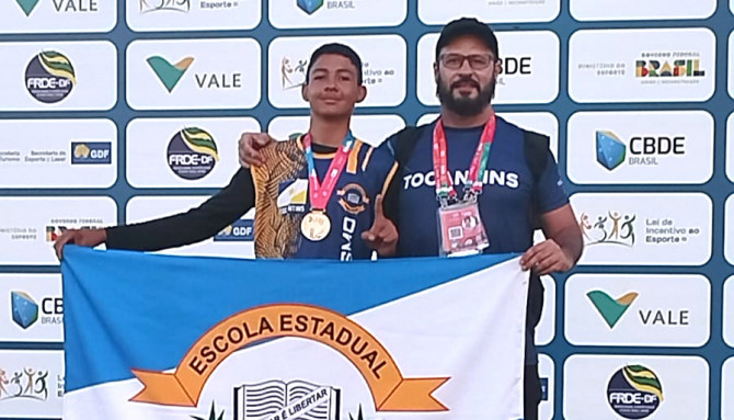 Destacando-se no Atletismo, o estudante-atleta David Samuel Santana, da Escola Estadual XV de Novembro, em Tocantinópolis, conquistou a medalha de bronze na série prata, na modalidade de Lançamento de Dardos.